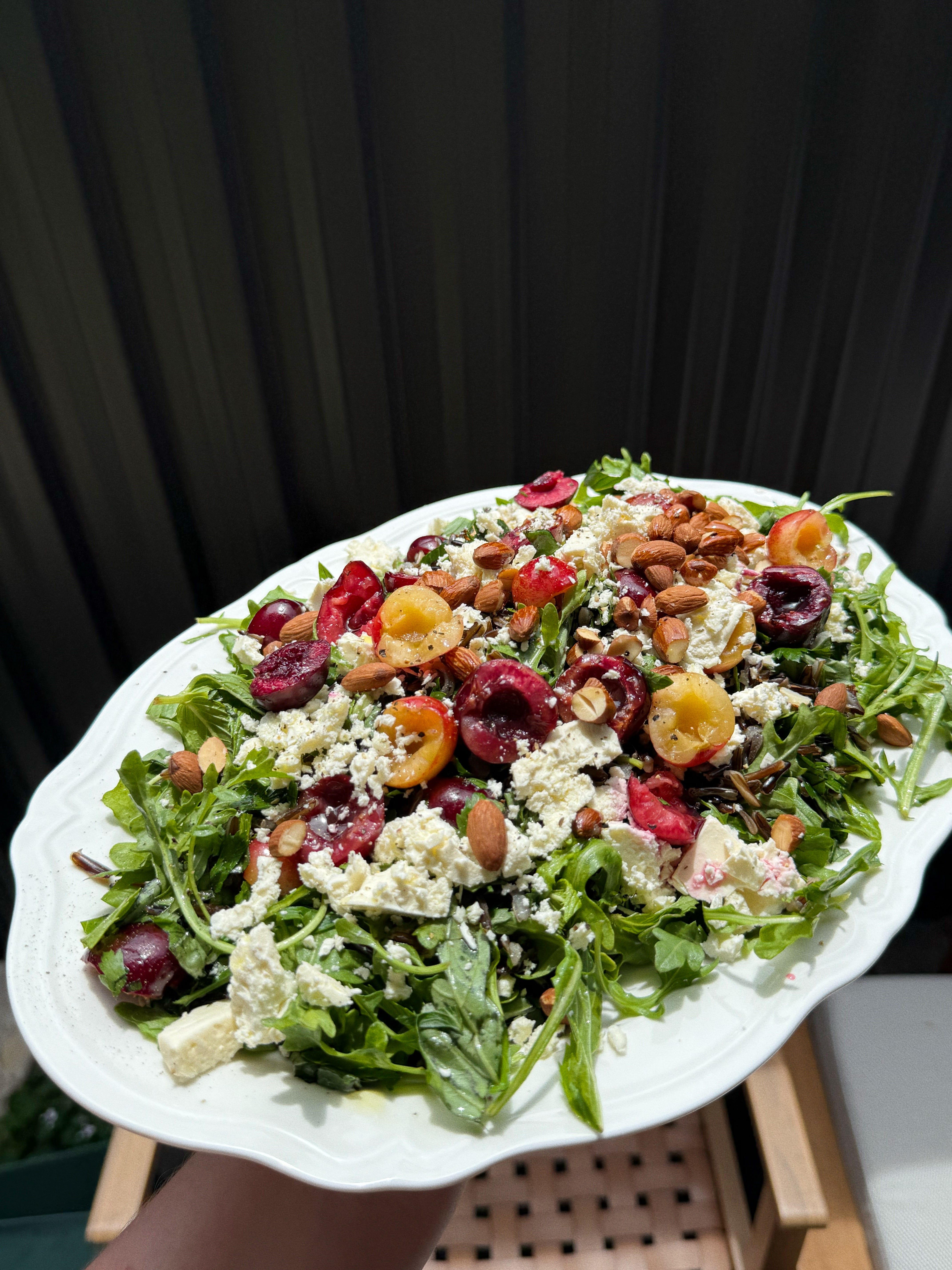 The salad is full of herbs and topped with creamy feta and crunchy dry-roasted almonds. A quick pickle is when you soak fresh fruit or vegetables in a simple mixture of acid, a touch of sweetness and salt. The process slightly softens the fruit and brings out a bright, tangy flavour that lifts the whole dish. Pickling the cherries adds a little burst of acidity and balances the richness of the rice and cheese in the most delicious way.